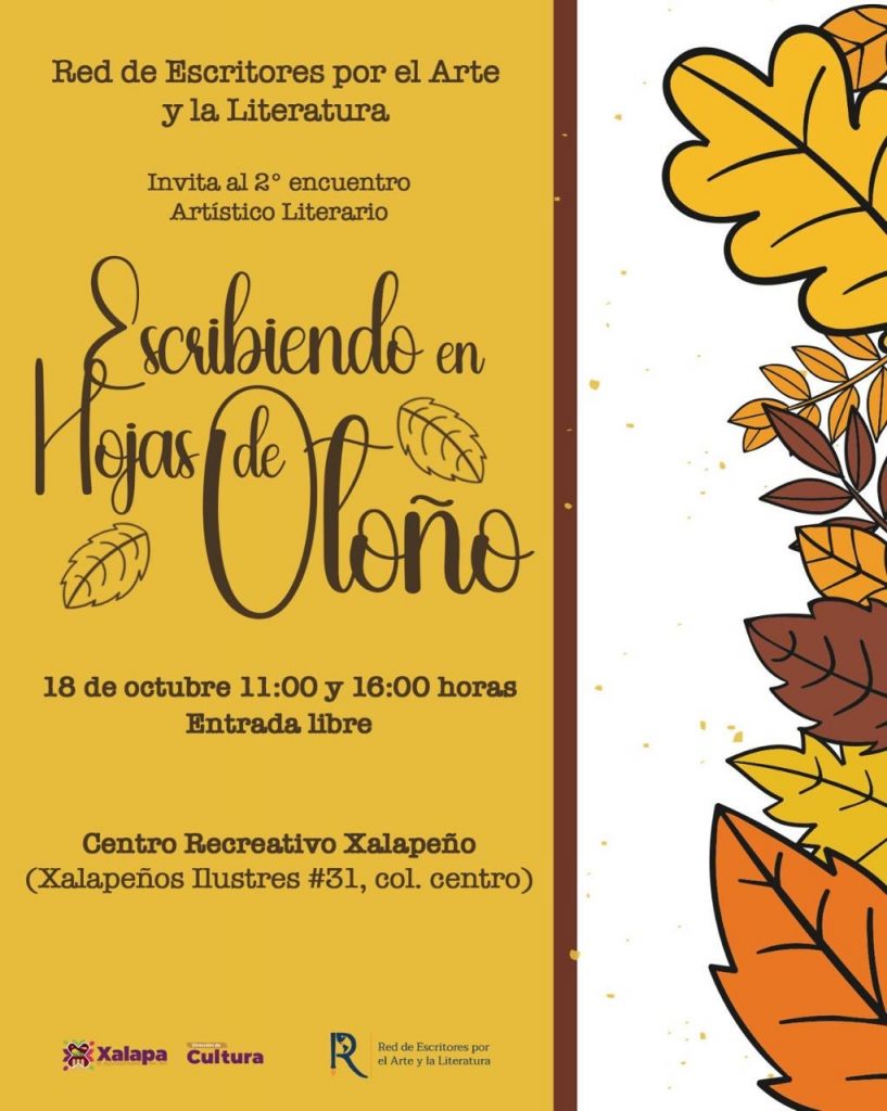 El viernes 18 de octubre a las 11:00 y 16:00 horas en el CRX, la Red de Escritores por el Arte y la Literatura desarrollarán el 2° Encuentro Artístico Literario “Escribiendo en hojas de otoño”; a las 12:00 horas en el Barrio Mágico de Xallitic, está agendado el espectáculo musical “Xalapa Vive”.