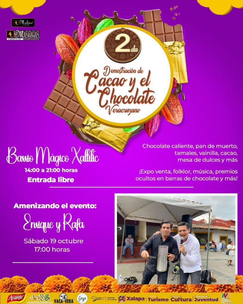 A las 17:00 horas en el Barrio Mágico de Xallitic, Enrique y Rafa amenizarán la segunda Demostración de Cacao y el Chocolate Veracruzano, y en el Museo de la Música Veracruzana, Azucena García y Eliezer Alejandro, ofrecerán el recital “Cantos de México”; media hora después habrá un recorrido por este espacio cultural y el “Concierto de escucha profunda”, en el CRX, a cargo de Soliloquio.