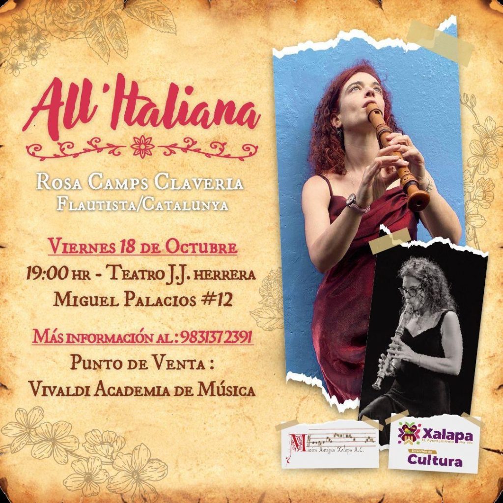 A las 18:00 horas en el Museo de la Música Veracruzana, alumnos de “Mumo, Estudio de Piano y Violín”, llevarán a cabo su Recital de Otoño; a las 19:00 horas en el Parque Juárez se presentará “Savir Ogma”, y en el Teatro J.J. Herrera, Rosa Camps Claveria encabezará el concierto “All Italiana”; a las 19:30 horas en el auditorio de la IMAC está pautada la obra cómica “La catrina”, de Fredy Vivanco.