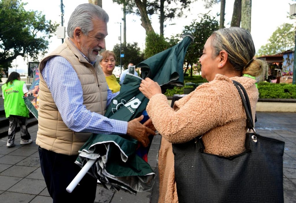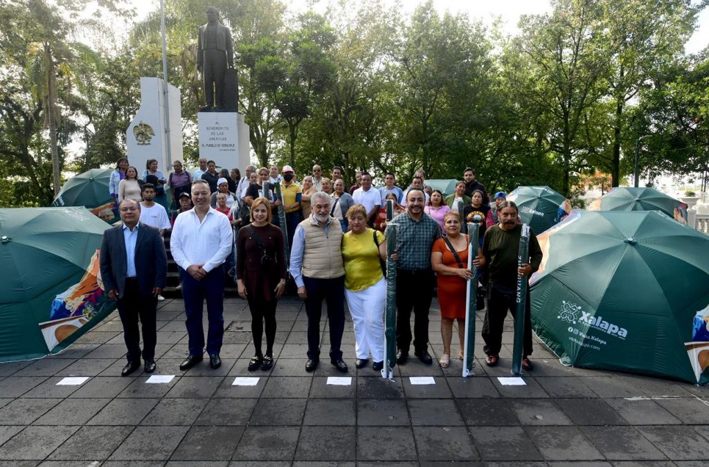 Xalapa, Ver.- Con el propósito de fortalecer la identidad turística de Xalapa y homogeneizar la imagen comercial del parque Benito Juárez, el alcalde Alberto Islas Reyes entregó sombrillas con imágenes turísticas a vendedores de este espacio emblemático de la ciudad.