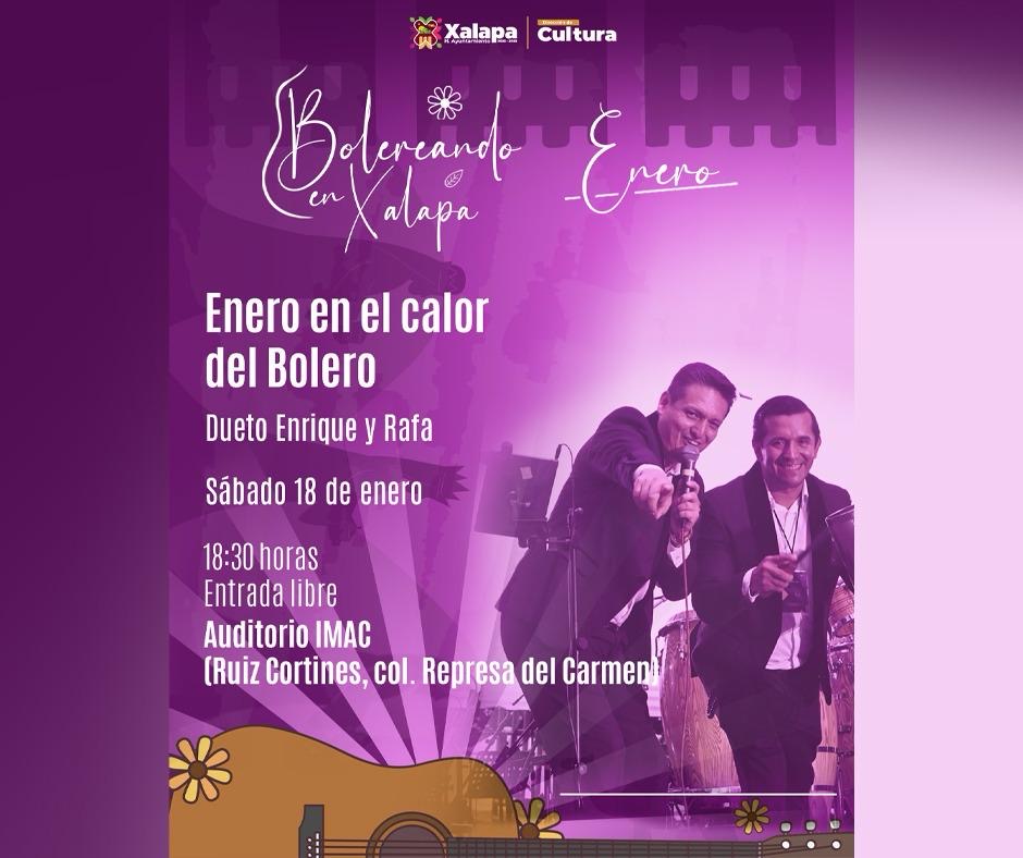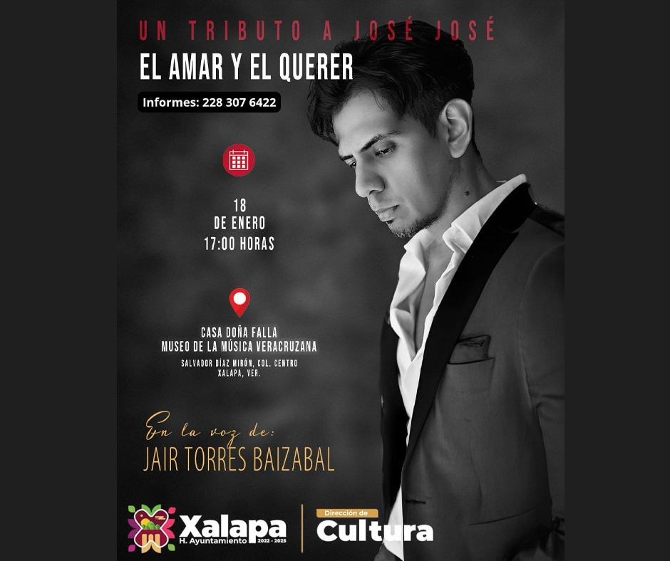 Este mismo día, Jair Torres Baizabal ofrecerá un tributo a José José, a las 17:00 horas, en el Museo de la Música Veracruzana. En este mismo recinto iniciará el taller de Violín que imparte Leonora San Germán, a las 12:00 horas.El programa Bolereando en Xalapa continúa con el ritmo de Enrique y Rafa, el sábado 18 de enero a las 18:30 horas, en el auditorio de la IMAC.