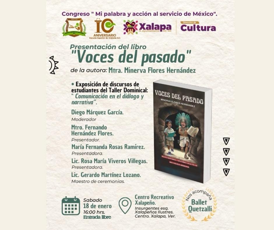 El sábado 18 de enero se presentará el libro “Voces del pasado”, en el Centro Recreativo Xalapeño, a las 16:00 horas. Y como parte del programa “ApantallArte”, se proyecta la película “El Vuelo”, en el Parque Juárez, a las 19:00 horas.