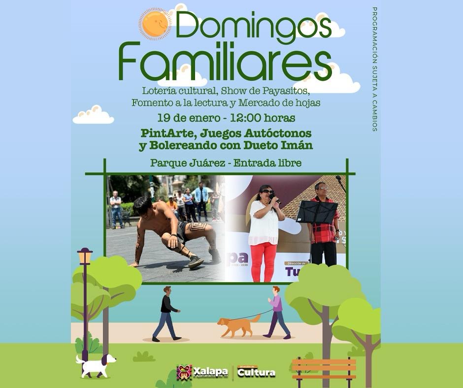 El domingo 19 de enero, a las 12:00 horas, continúan los “Domingos Familiares” con un show de payasitos, lotería Cultural, Mercado de Hojas, Juegos autóctonos y el taller PintArte, en el Parque Juárez.