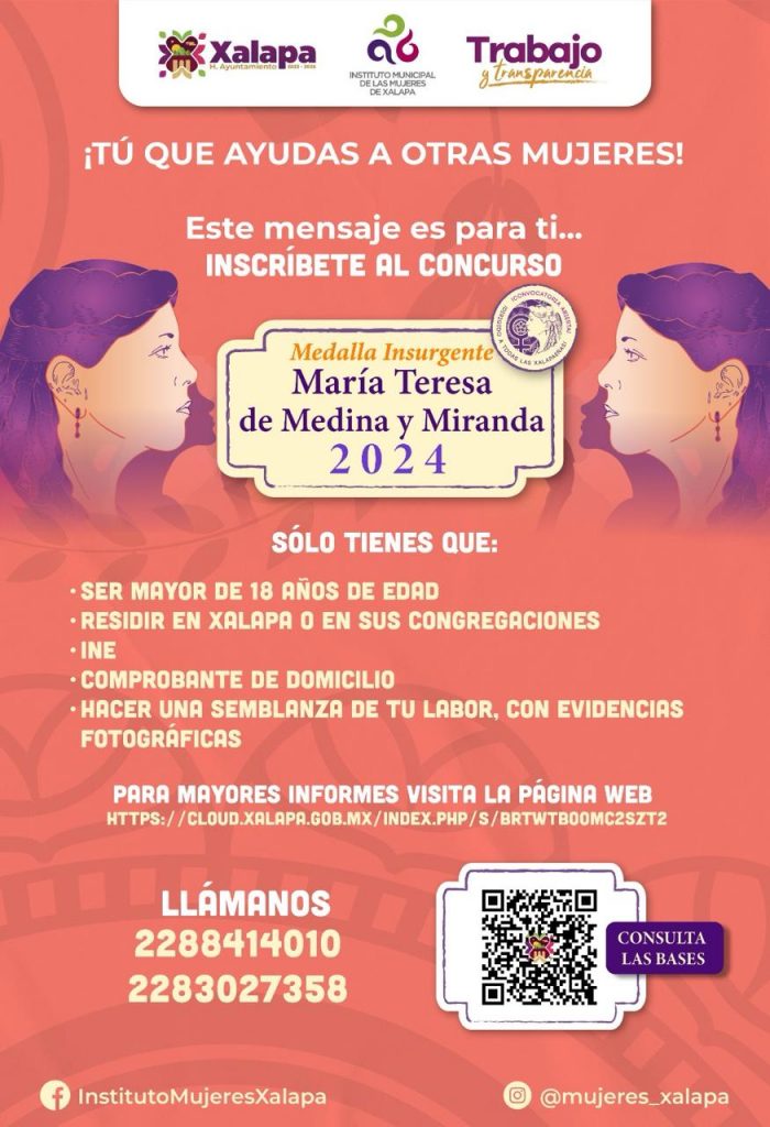 Xalapa, Ver.- El 16 de febrero vence el plazo para inscribirse en la convocatoria para la entrega de la Medalla Insurgente “María Teresa de Medina y Miranda” 2024, por lo que el Instituto Municipal de las Mujeres de Xalapa (IMMX) invita a las interesadas a presentar su candidatura.