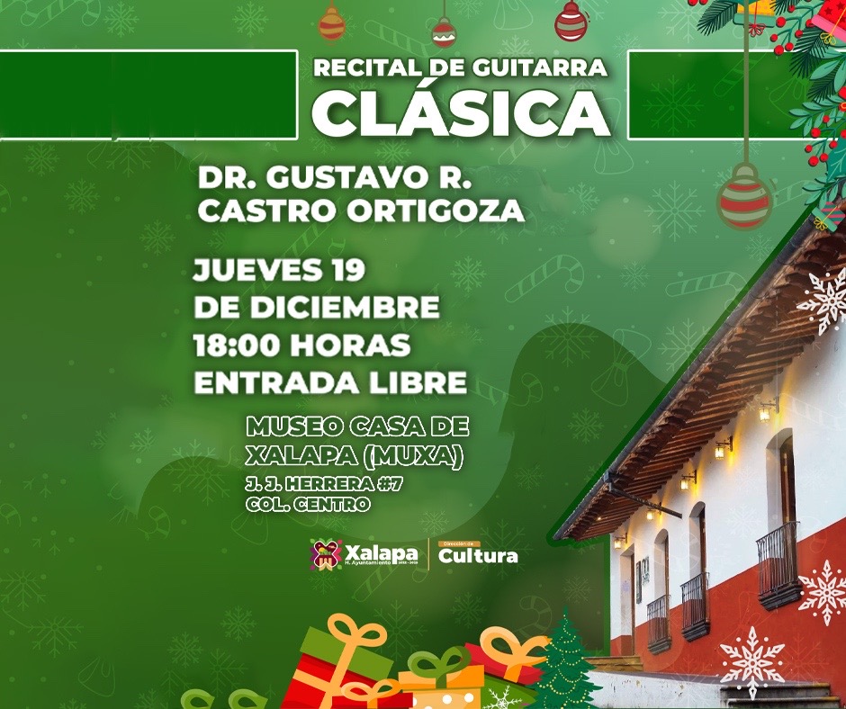 A las 17:00 horas, en el parque Juárez se presentan el Dueto El Primo, la Fory five y los Tropicosos. En el Museo de la Música Veracruzana se realizará un Recital de Invierno con alumnos de piano y violín, a las 18:00 horas, y en el Museo Casa de Xalapa se tendrá el recital de guitarra clásica que presenta el doctor Gustavo R. Castro Ortigoza a la misma hora.