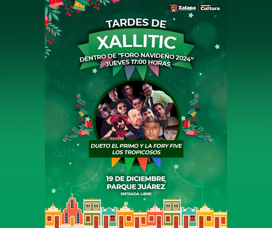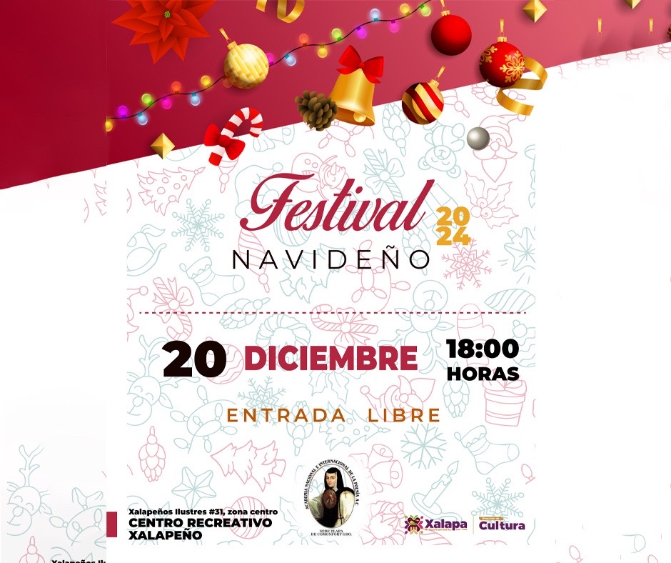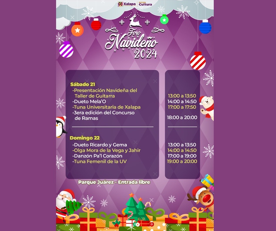 El 21 de diciembre continúa el Foro Navideño 2024 en el Parque Juárez, con actividades desde las 13:00 horas. Se tendrá la presentación de un taller de guitarra, el Dueto Mela´O, la Tuna Universitaria de Xalapa y la tercera edición del Concurso Municipal de Ramas 2024, a las 18:00 horas.