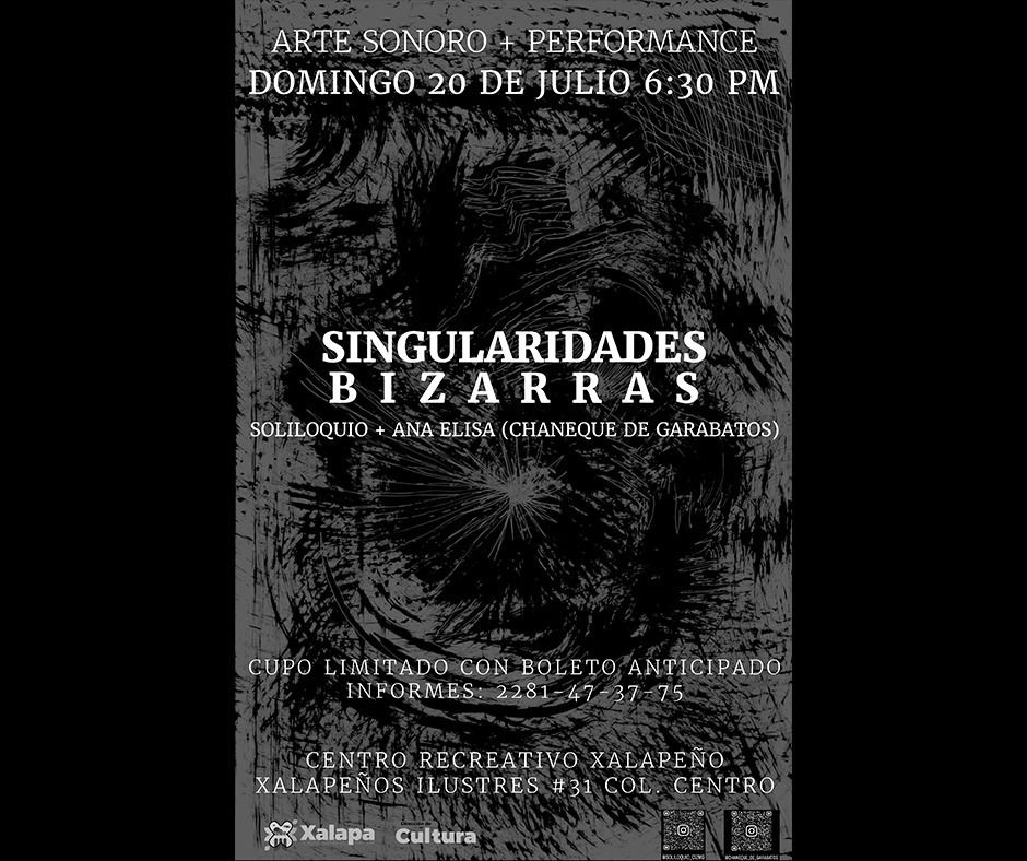 Las actividades culminarán a las 18:30 horas, en el CRX, con el concierto de arte sonoro y performance “Singularidades bizarras”, a cargo del proyecto Soliloquio y Ana Elisa, conocida como Chaneque de Garabatos.