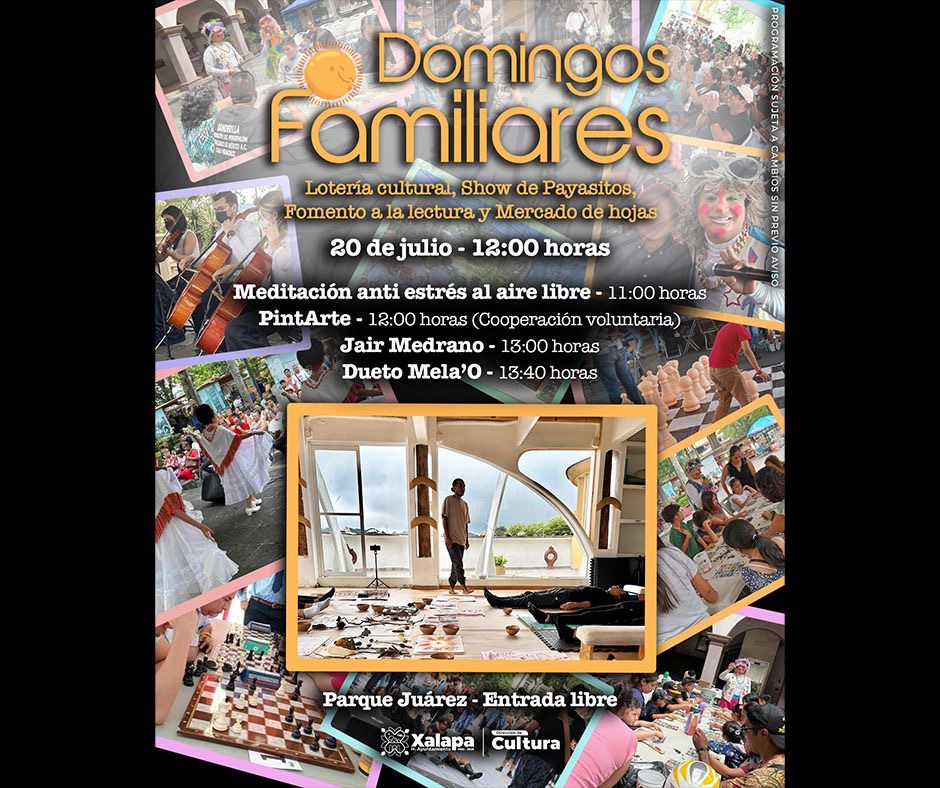 A las 12:00 horas, se celebrará el programa “Domingos Familiares” con actividades como Lotería Cultural, un show de payasitos, fomento a la lectura con Mercado de Hojas, meditación anti-estrés, el taller PintArte y las presentaciones de Jair Medrano y el Dueto Mela´O.