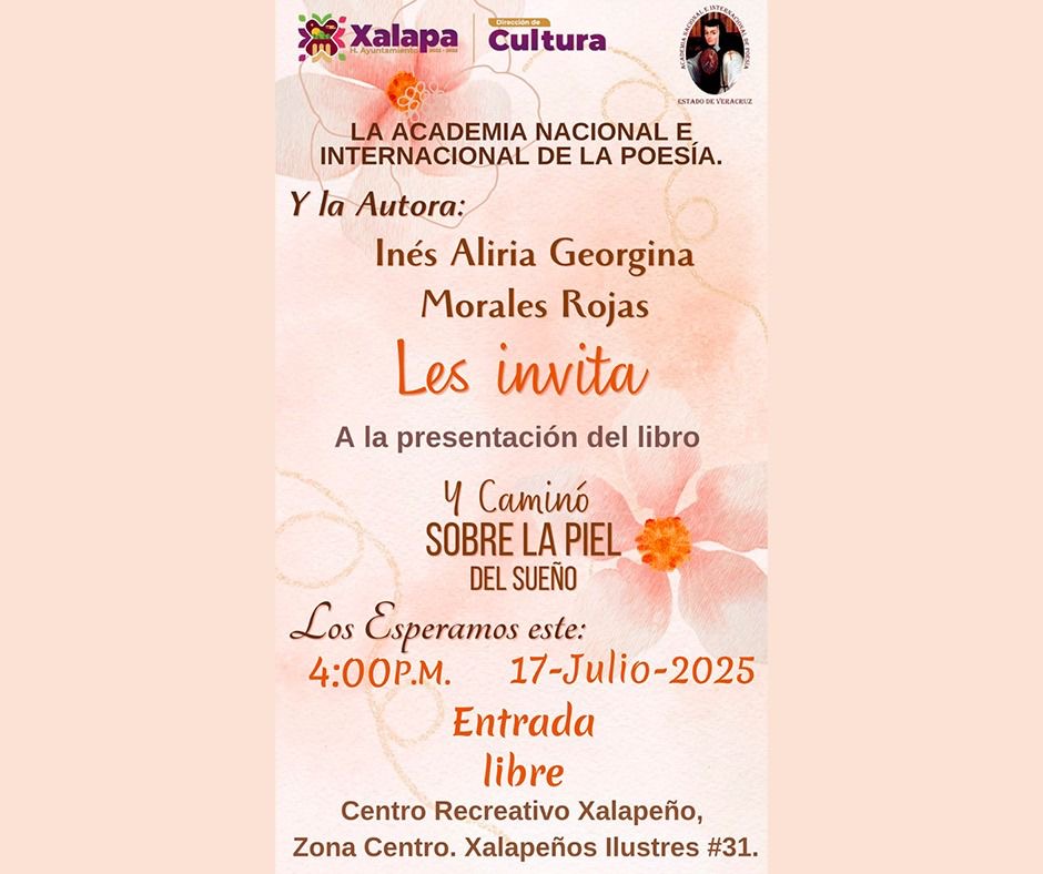 El jueves, a las 16:00 horas, el CRX será sede de la presentación del libro “Y caminó sobre la piel del sueño”, de Inés Aliria Georgina Morales Rojas, actividad organizada por la Academia Nacional e Internacional de la Poesía.
