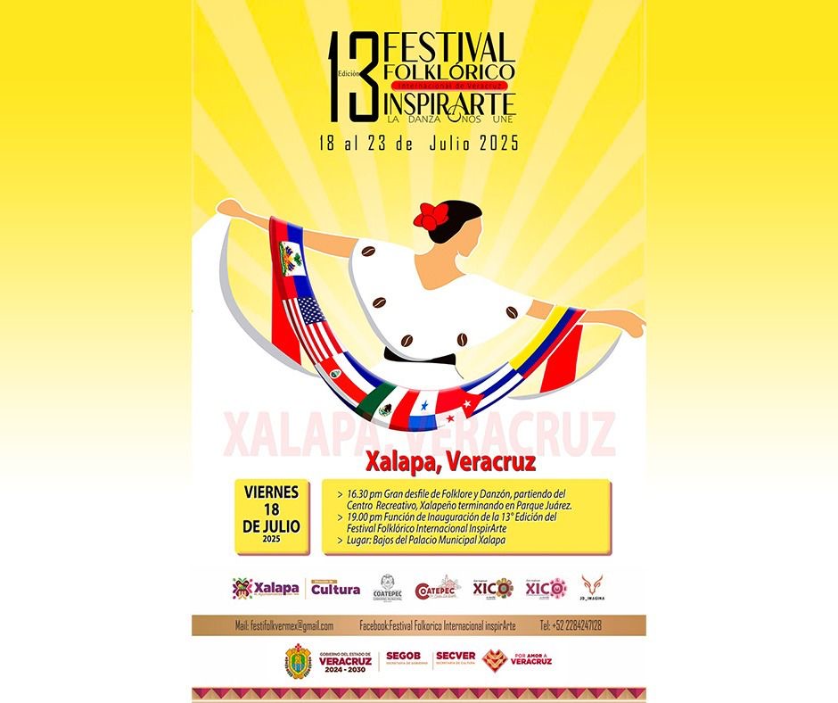 A las 16:30 horas iniciará el Festival Folklórico Internacional de Veracruz Inspirarte, en su décima tercera edición, con un desfile del CRX al Parque Juárez. La función inaugural será a las 19:00 horas en Palacio Municipal.