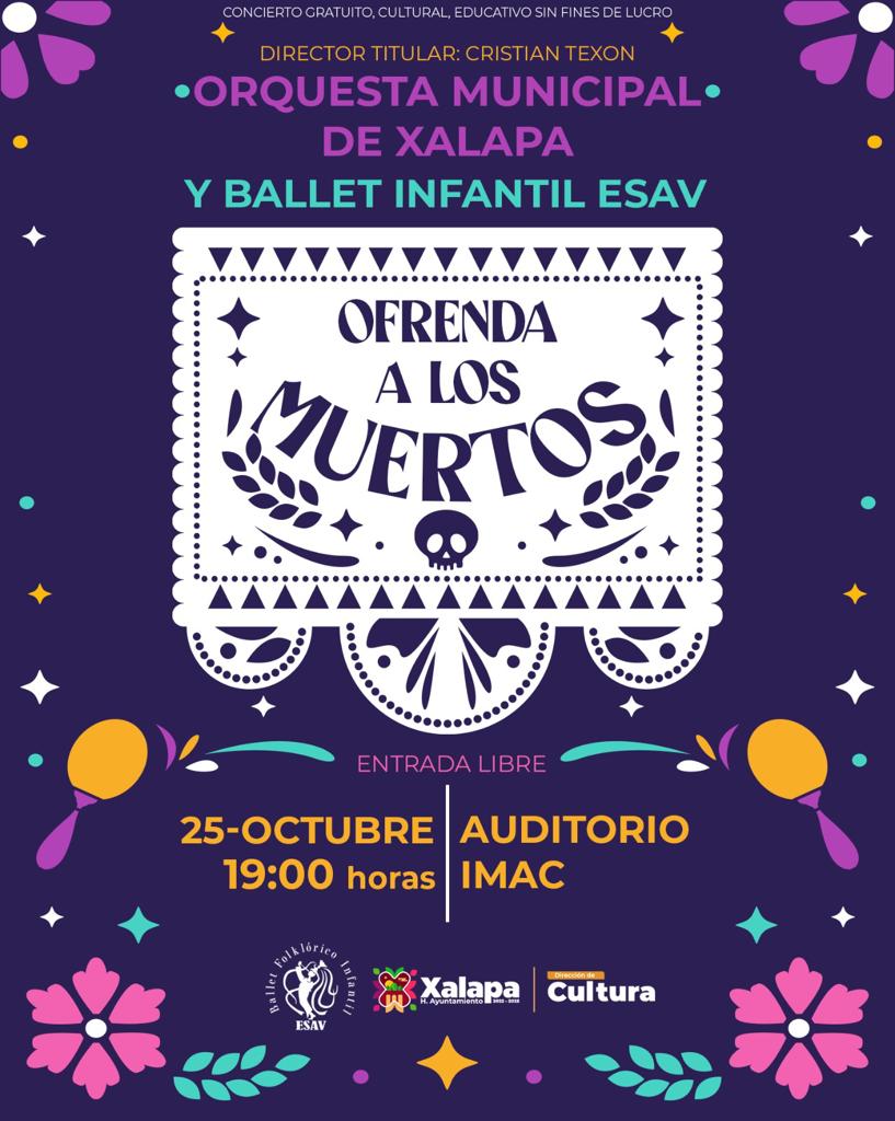 También, a las 18:00 horas en el CRX, Cultura Danzón ofrecerá la conferencia “Hablemos de Danzón Sesión 3”, y dentro del Ciclo de Cine Ofrenda y Memorias, se proyectará el largometraje “Macario”. A las 19:00 horas en el Teatro J.J. Herrera, el Espacio de Formación de Danzas Afro presentará su espectáculo “Mujer Tierra”, y en paralelo, la Orquesta Municipal de Xalapa y el Ballet Infantil de la ESAV estarán en el auditorio de la IMAC.