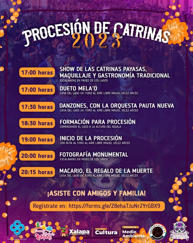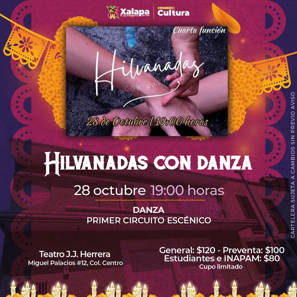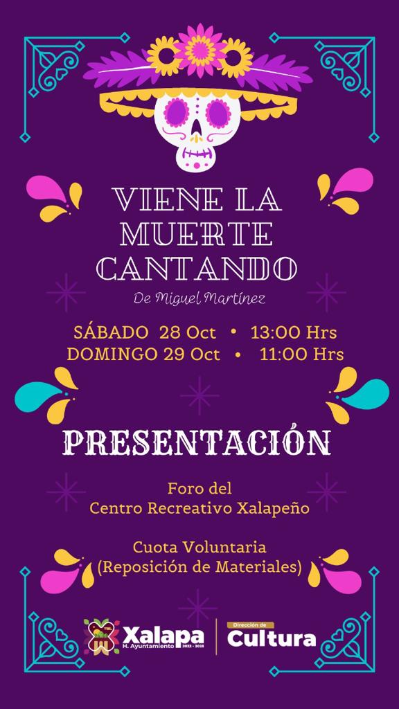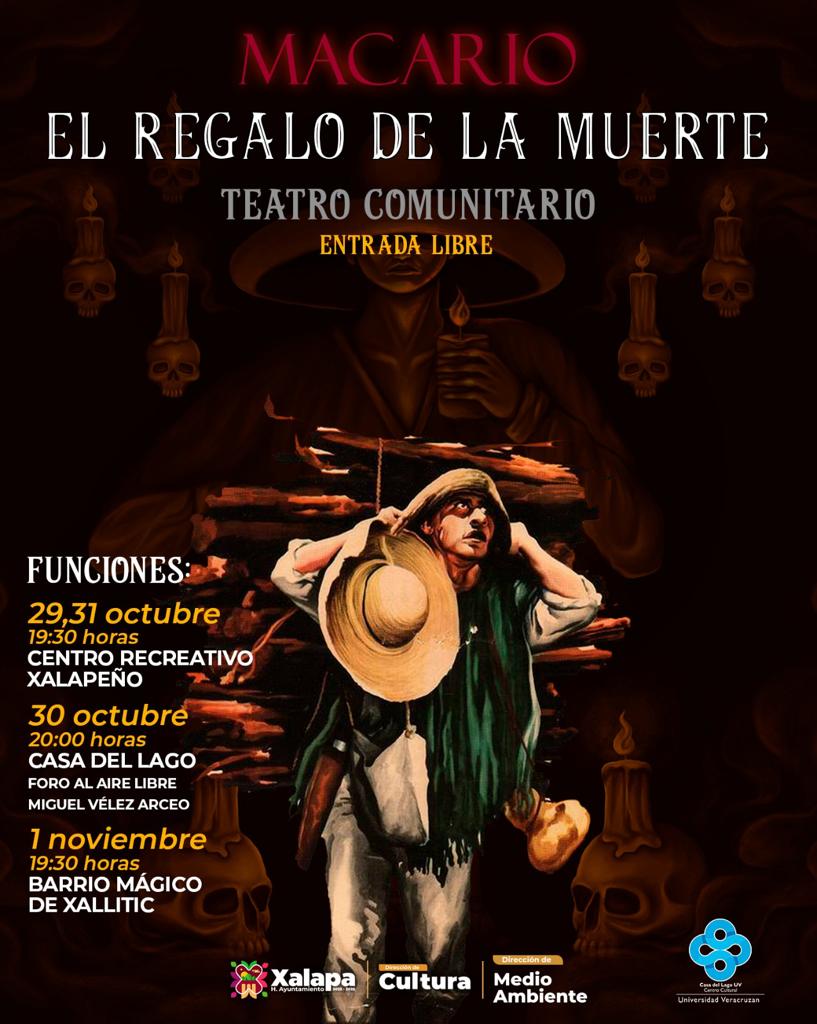 El domingo 29 de octubre a las 13:00 horas en el auditorio de la IMAC, el Ballet Folklórico Aztlán presentará “Tanta Danza”; y este día y el 31 de octubre a las 19:30 horas en el CRX y el 30 a las 20:00 horas en la Casa del Lago, el Teatro Comunitario actuará la obra “Macario, el regalo de la muerte”. Asimismo, a las 18:00 horas por la avenida Circuito Presidentes habrá un “Paseo de Catrinas” y a las 20:00 horas en el Barrio Mágico de Xallitic, la Orquesta Municipal de Xalapa y el Ballet Folclórico de la ESAV estarán “Cantando a los muertos”.