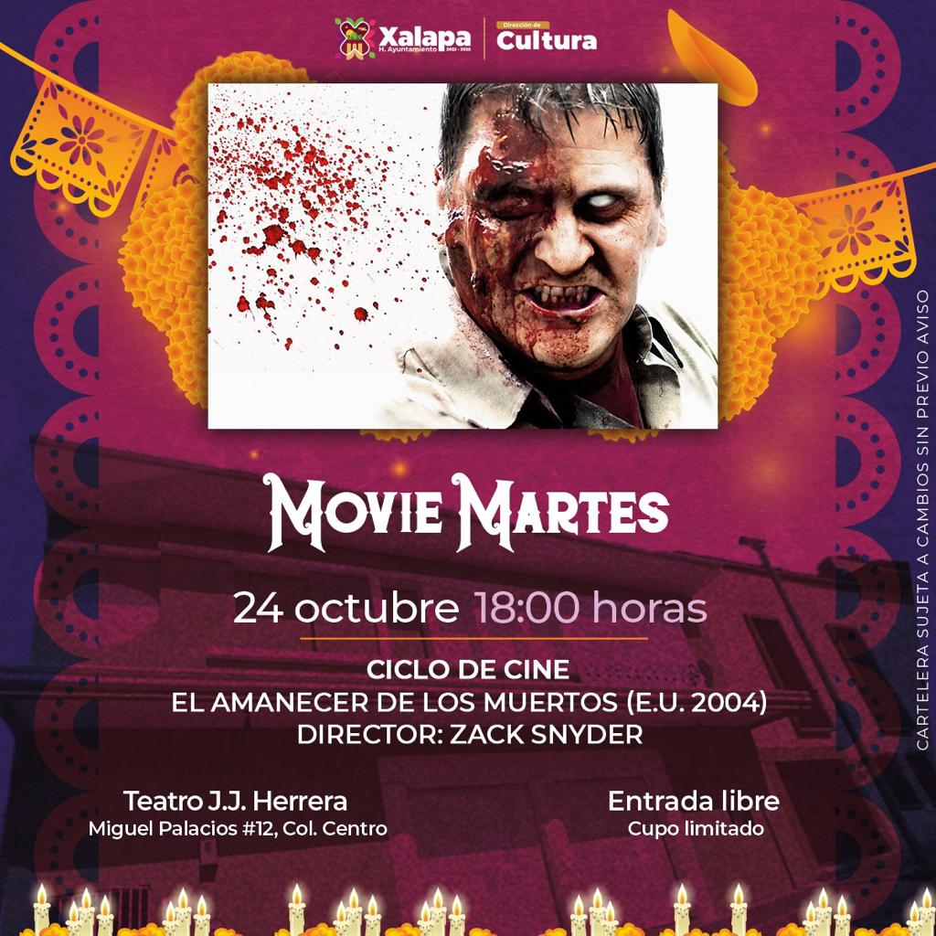En el “Movie martes” de este 24 de octubre se proyectará la película “El amanecer de los muertos” (EEUU 2004), del director Zack Snyder, a las 18:00 horas en el Teatro J.J. Herrera; a las 19:00 horas en el Centro Recreativo Xalapeño (CRX), se exhibirá el filme “Mûpã”, del director David Herrera, como parte del Ciclo de Cine “Doctubre”; y a la misma hora, pero en el lobby de la Iniciativa Municipal de Arte y Cultura (IMAC), se inaugurará un Altar de Muertos con la participación de la Orquesta Pauta Nueva y el Ballet Folklórico Aztlán.