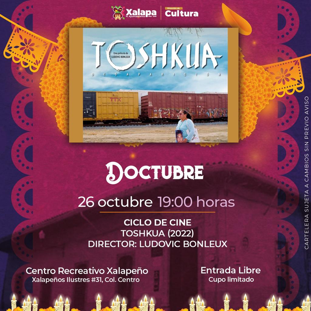 El jueves 26 de octubre a las 9:00 horas en el parque Benito Juárez se expondrán los “Altares de Vida”; a las 17:00 horas, las “Tardes de Xallitic” contarán con la participación de Salsa Cumbiando y el Dueto de Enrique y Rafa; a las 19:00 horas en el CRX, Doctubre presentará “Toshkua” (2022), del director Ludovic Bonleux.