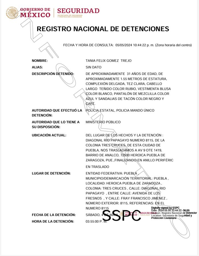 De acuerdo con el Registro Nacional de Detenciones, en un operativo conjunto realizado este sábado por la Policía Estatal y la Marina fue detenida detención de Gómez Trejo, ocurrió el pasado sábado 4 de mayo, en un domicilio ubicado en Diagonal Río Papagayo, número 8115, de la colonia Tres Cruces, de la capital poblana, cerca de las 4 de la tarde.