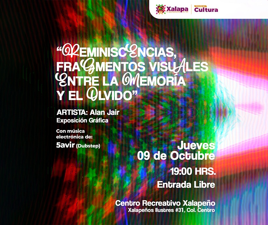 A las 19:00 horas, en el CRX, se inaugurará la exposición gráfica de Alan Jair: “Reminiscencias, fragmentos visuales entre la memoria y el olvido”, ambientada con la música electrónica de 5avir.