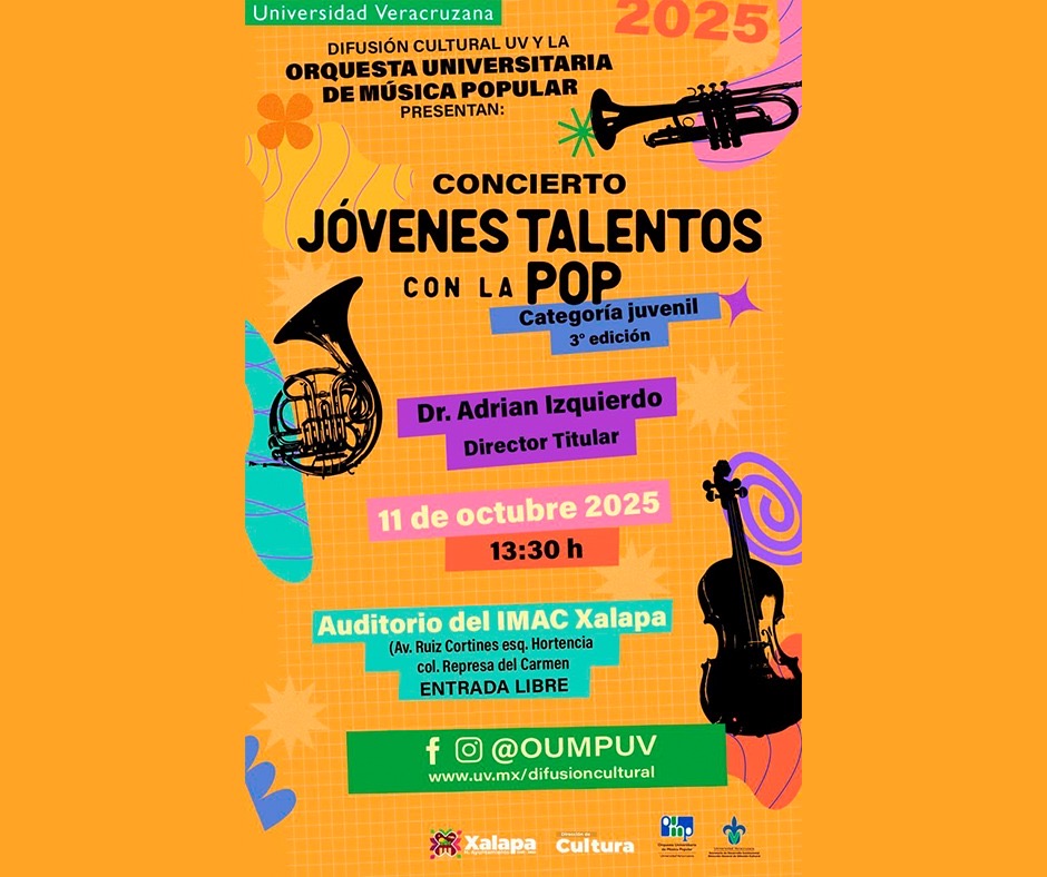 El sábado, a las 13:30 horas, la Orquesta Universitaria de Música Popular ofrecerá el concierto “Jóvenes talentos con la POP”, en el auditorio de la IMAC. A las 17:00 horas, en el Museo de la Música Veracruzana, se tendrá la música compuesta del maestro Raúl Ladrón de Guevara, con Guadalupe Colorado, Cecilia Ladrón de Guevara, Armando Mora e Isabel Ladrón de Guevara.