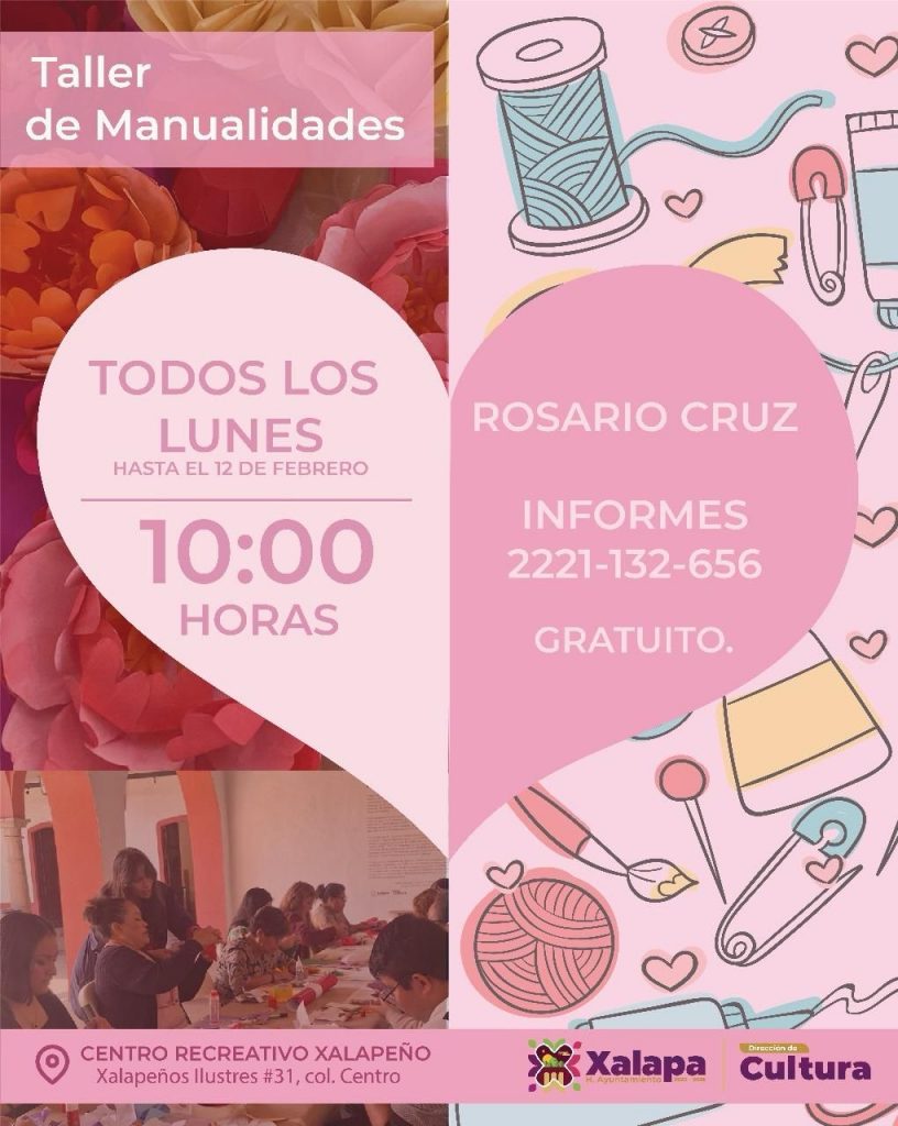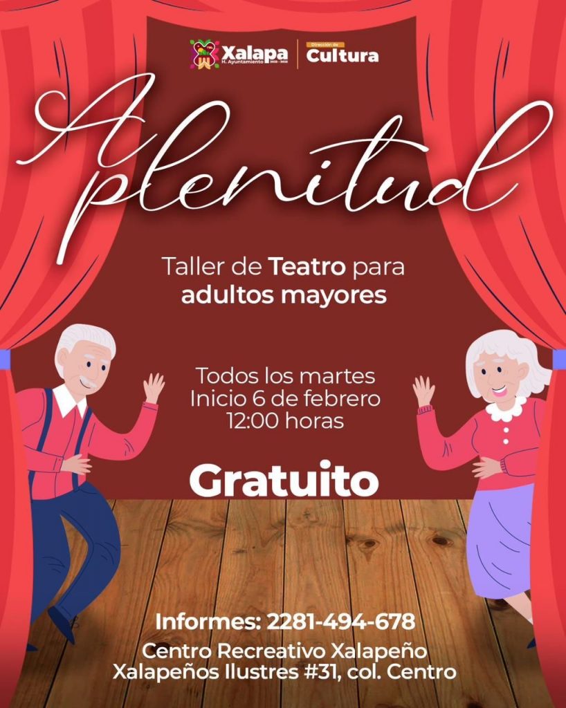 Por otro lado, Rosario Cruz impartirá el Taller de Manualidades en el Centro Recreativo Xalapeño todos los lunes hasta el 12 de febrero; y todos los martes a las 12:00 horas, en este mismo recinto cultural, se impartirá el Taller de Teatro “A plenitud”, dirigido a personas adultas mayores. Ambos cursos son gratuitos.