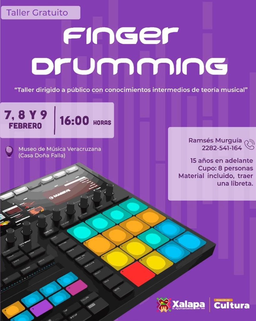 Los días 7, 8 y 9 de febrero a las 16:00 horas en el Museo de la Música Veracruzana, Ramsés Murguía impartirá el taller gratuito “Finger Drumming” dirigido a público con conocimientos en teoría musical.