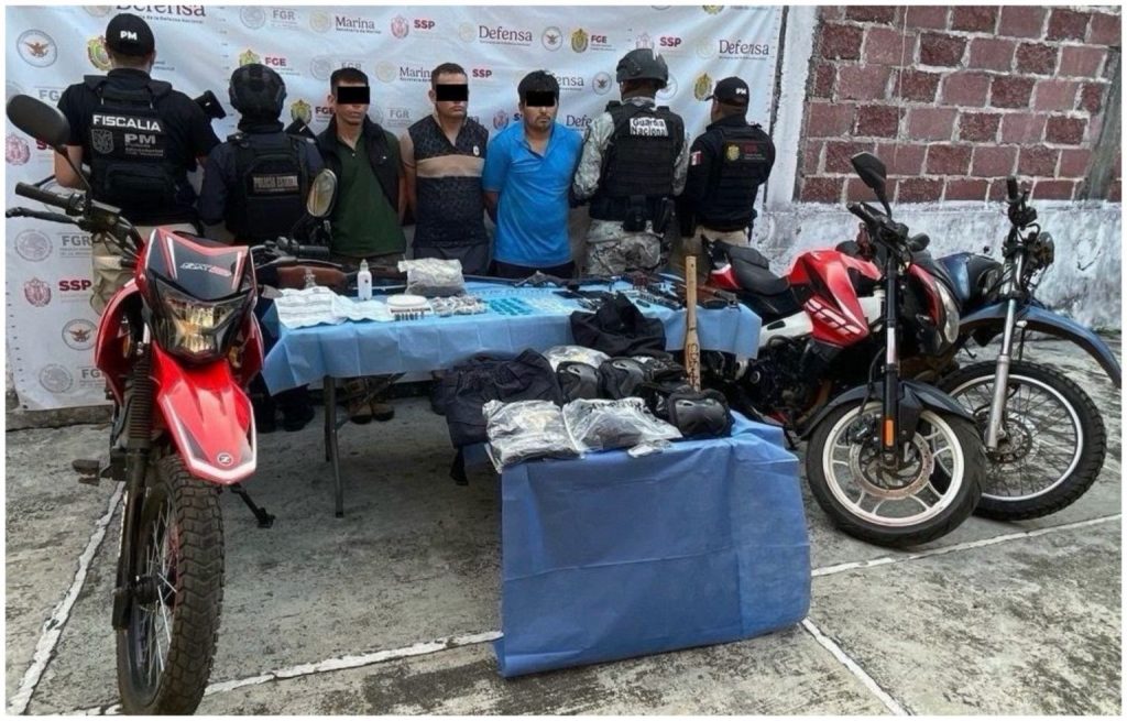 Asimismo, se aseguraron tres armas de fuego cortas, una larga y una réplica, cartuchos útiles, cargadores, un arma blanca y equipamiento táctico; además de celulares, básculas, pipas y cinco motocicletas, dos con el NIV alterado y tres sin reporte de robo.