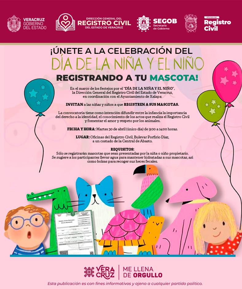 En el marco del Día de la Niña y el Niño, el Ayuntamiento y la Dirección General del Registro Civil del Estado de Veracruz, invitan a niñas y niños propietarios de perros y gatos a participar en el Registro de Nacimiento de Mascotas, que se realizará el próximo 30 de abril.