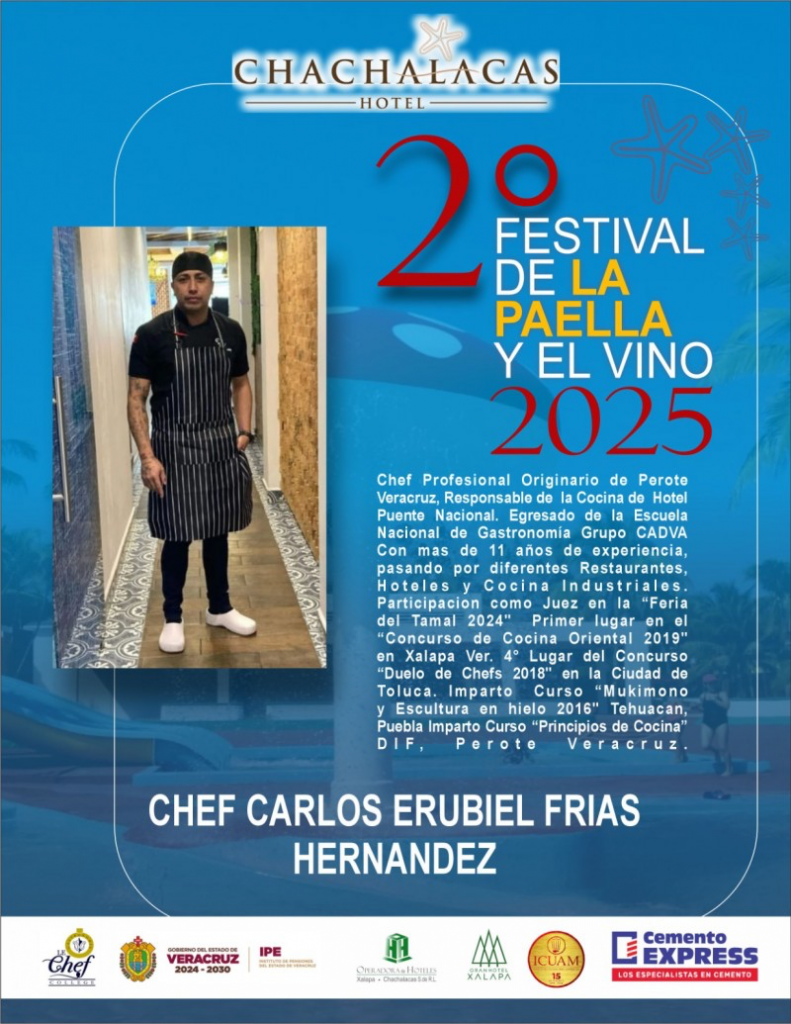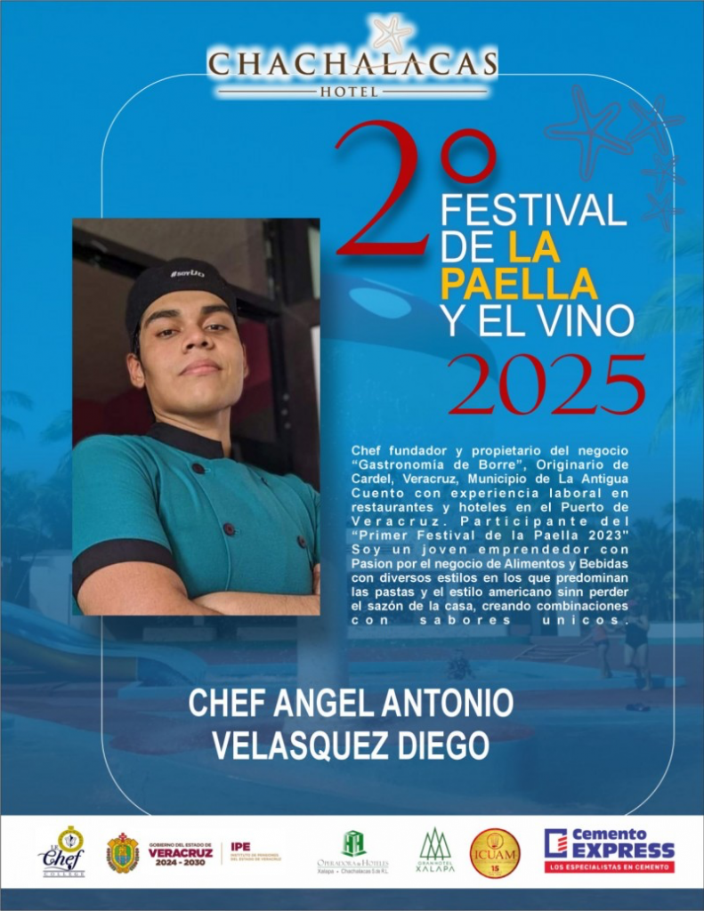 Sebastián Hernández Ramos, actualmente cursa la carrera de Gastronomía en el Instituto Culinario Américas y fue ganador del primer lugar en el Primer Festival de Paella Chachalacas 2024, gracias a sus destacadas habilidades culinarias.