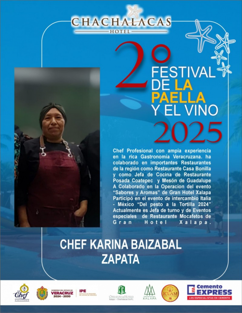 Karina Baizabal Zapata, ha colaborado en restaurantes de gran reconocimiento como Casa Bonilla, en Coatepec; Posada Coatepec y el Mesón de Guadalupe, entre otros. Actualmente es jefa de turno y de eventos especiales del restaurante Mocafetos, del Gran Hotel Xalapa.