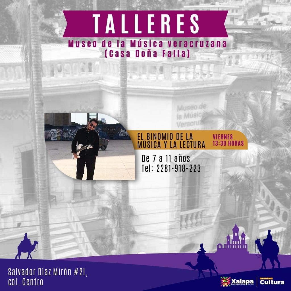 En la Casa Doña Falla Museo de la Música Veracruzana, los viernes a las 13:30 horas seguirán los talleres El Binomio de la Música y la Lectura; y los miércoles a las 16:00 horas, el de Son Jarocho. Entre tanto, en el Taller de Arte Popular (TAP), de lunes a viernes a las 10:00 horas, habrá talleres de Alfarería, Orfebrería, Talla de madera, Cartonería, Dibujo y Papel maché.