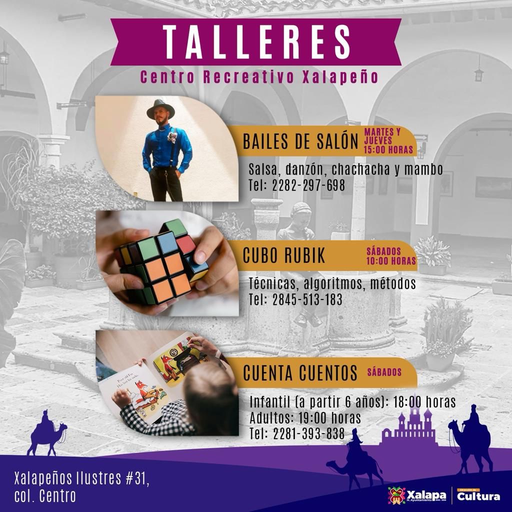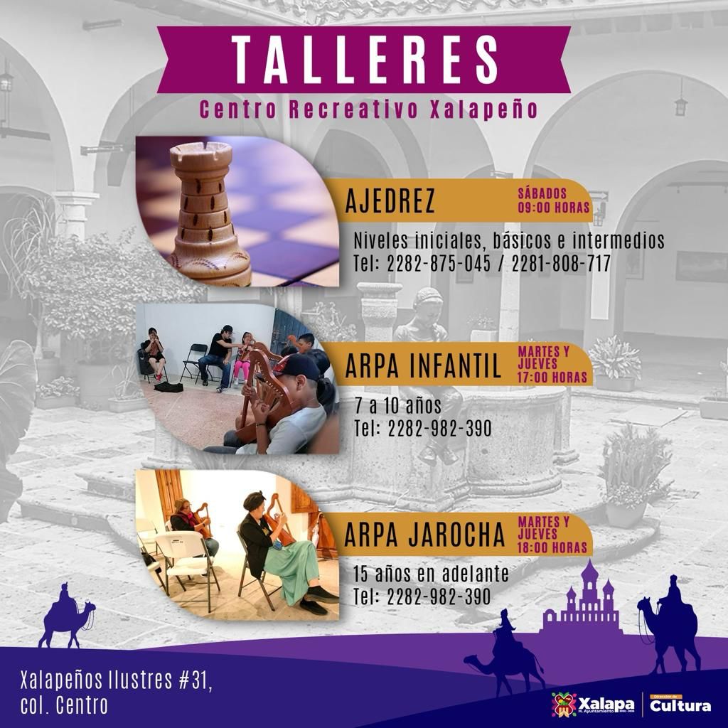 Por otro lado, en el Centro Recreativo Xalapeño continuarán impartiéndose los talleres de Ajedrez todos los sábados a las 9:00 horas; de Bailes de Salón, Arpa Infantil y Arpa Jarocha, martes y jueves a las 15:00, 17:00 y 18:00 horas, respectivamente; Cubo Rubik, Culturama y Cuenta cuentos, los sábados a las 10:00, 11:00 y 18:00 horas; Danzoneando, los lunes, miércoles y sábados; y Guitarra, los sábados y domingos.