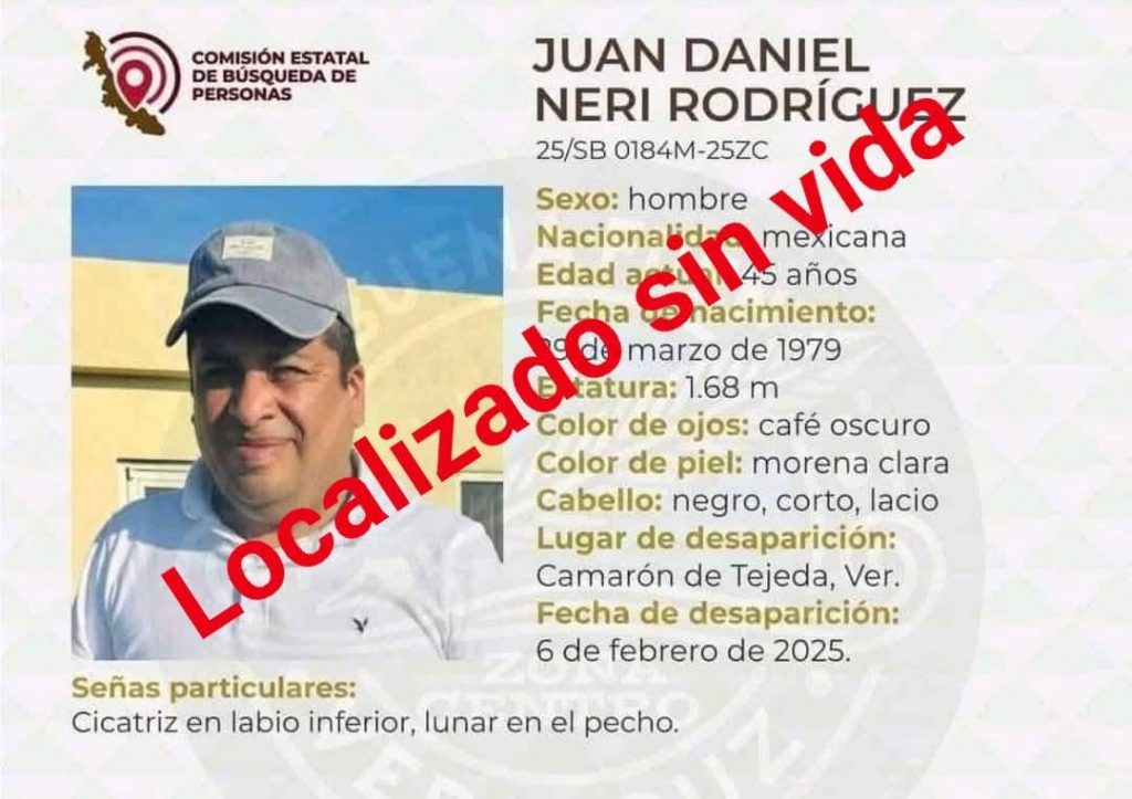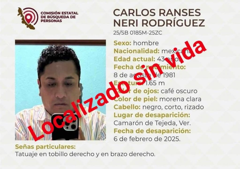 La Fiscalía General del Estado informa que este día fueron localizados sin vida los cuerpos de las víctimas Carlos Ransés Neri Rodríguez, quien fungiera como secretario del Ayuntamiento de Paso del Macho, y de su hermano Juan Daniel Neri Rodríguez quienes habían sido reportados como desaparecidos por sus familiares el pasado 6 del presente mes.