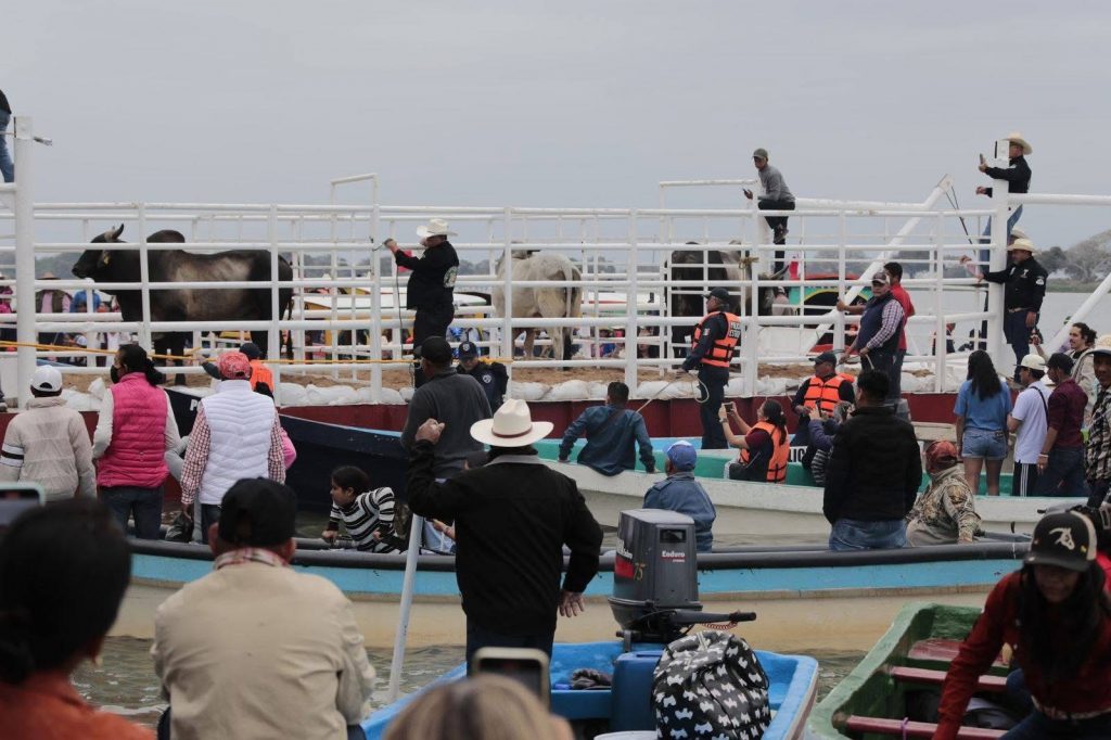 Como parte del espectáculo, los bovinos cruzaron el río Papaloapan a bordo de una panga, un acto que se ha convertido en símbolo de la festividad, para luego ser liberados en el muelle de la ciudad, en medio de una escena cargada de colorido que atrajo a una multitud.