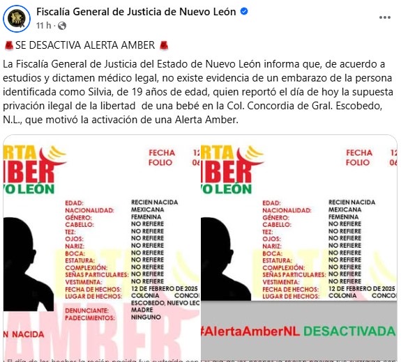 “La Fiscalía General de Justicia del Estado de Nuevo León informa que de acuerdo a un estudio y dictamen médico legista no existe evidencia de un embarazo de la persona identificada como Silvia de 19 años de edad, misma que reportó el día de hoy el supuesto secuestro de una bebé en la Col. Concordia de Gral. Escobedo, N.L y que derivó en la activación de una Alerta Amber”, se lee en el reporte emitido por la Fiscalía de Nuevo León.