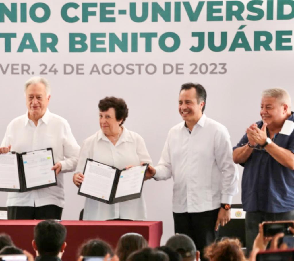 El acto protocolario de firma de convenio se llevó a cabo en esta ciudad, donde asistieron además como invitados de honor el Gobernador de Veracruz, Cuitláhuac García Jiménez y firmaron por las partes interesadas el Director de la CFE, Manuel Bartlett y la titular de la Coordinación de las Universidades Benito Juárez, Raquel Sosa Elizaga.