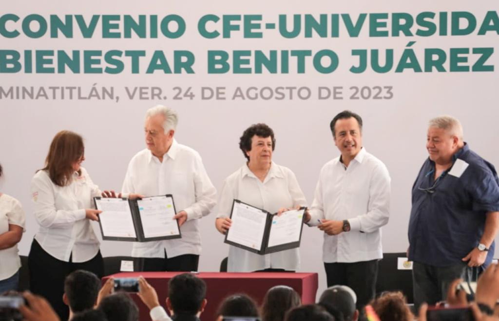 MINATITLÁN, Ver.- 25 de Agosto del 2023. El Gobierno de México concretó hoy uno de los proyectos más ambiciosos en beneficio de los estudiantes de la Universidad Benito Juárez al signarse un convenio con la Comisión Federal de Electricidad que permitirá a los egresados incorporarse a la actividad productiva dentro de la paraestatal al concluir sus estudios.