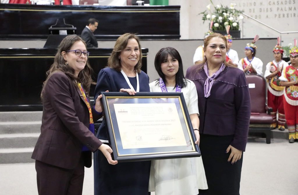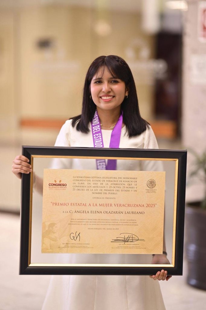 En sesión solemne del Congreso del Estado, la gobernadora Rocío Nahle García entregó el Premio Estatal a la Mujer a Ángela Elena Olazarán Laureano, joven originaria de Papantla, quien en 2024 fue reconocida con el Global Student Prize como la mejor estudiante del mundo.