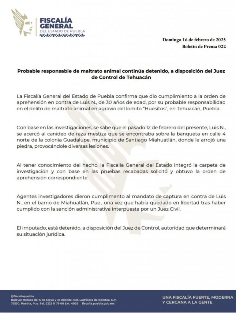 Este domingo 16 de febrero, se llevó a cabo la Audiencia Inicial en la que la Fiscalía Puebla obtuvo la vinculación a proceso a Luis “N”, conocido en Santiago Miahuatlán como “Colamocha”, por el delito de crueldad animal.