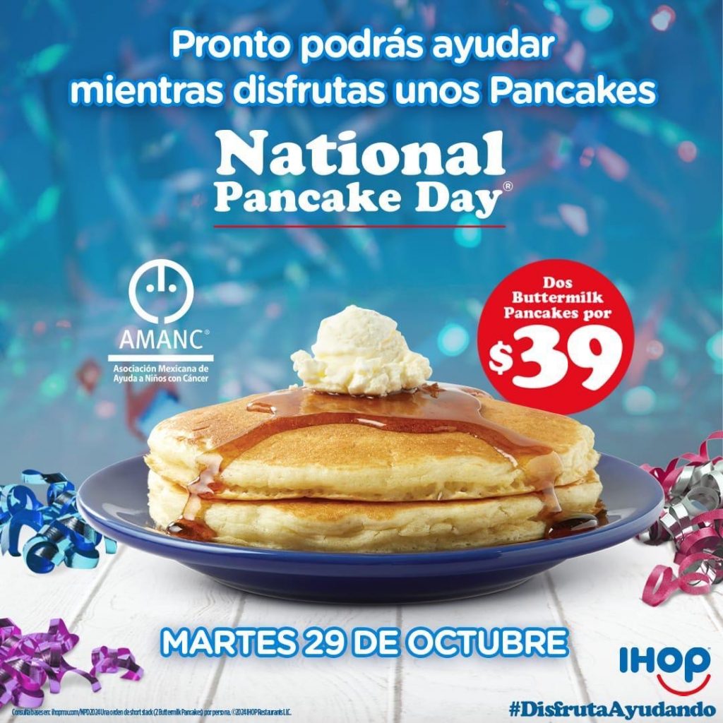 Xalapa, a 28 de octubre 2024. IHOP® de México celebra unaño más el National Pancake Day, ofreciendo sus emblemáticosButtermilk Pancakes a un precio especial de $39.00 MXN. Esteevento se llevará a cabo el 29 de octubre en todos los restaurantesIHOP® de la República Mexicana. Lo recaudado será destinado parael tratamiento contra el cáncer infantil, trabajando de la mano dealiados como la Asociación Mexicana de Ayuda a Niños con Cáncerde Veracruz (AMANC).