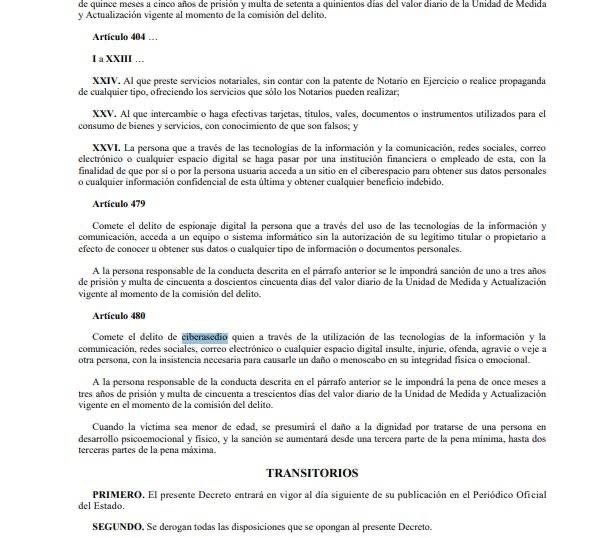 Tras la aprobación de dicha normativa en el Congreso local,el gobernador Alejandro Armenta publicó en el Diario Oficial la “ley censura”, que implica tres de cárcel y multa a quien insulte u ofenda de forma insistente en redes sociales, bajo el nuevo delito de “ciberasedio”.