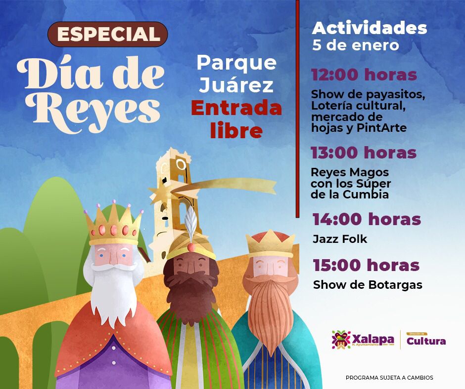 El domingo 5 de enero se tiene un programa especial por el Día de Reyes en el parque Benito Juárez. Habrá show de payasitos, Lotería Cultural, Mercado de Hojas y PintArte, desde las 12:00 horas; a las 13:00 horas se presentan Los Súper de la Cumbia.