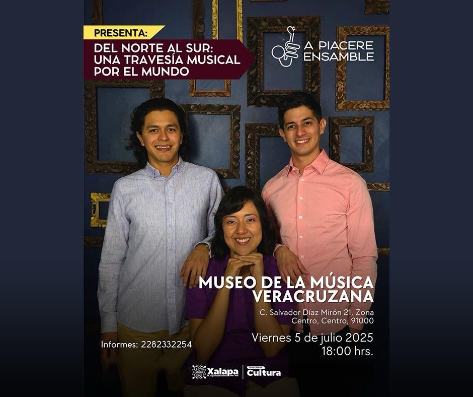 A las 15:00 horas, en el CRX, se presentará la obra “Oshin, siente la magia”; una hora más tarde, en el Museo de la Música Veracruzana, se realizará el recital “Alumnos de piano y violín”, y a las 18:00 horas, el grupo A Piacere Ensamble ofrecerá el concierto “Del norte al sur”, una travesía musical por el mundo.