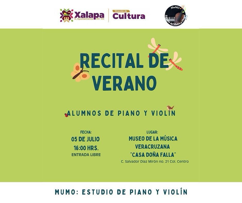 Este miércoles, en el Museo Casa de Xalapa (Muxa), se ofrecerán clases de metafísica con el tema “Dualidad: el secreto oculto en tu vida diaria”. A las 18:00 horas, en el Museo de la Música Veracruzana, se llevará a cabo el recital de fin de cursos del CIMI: Piano, violín y violonchelo.