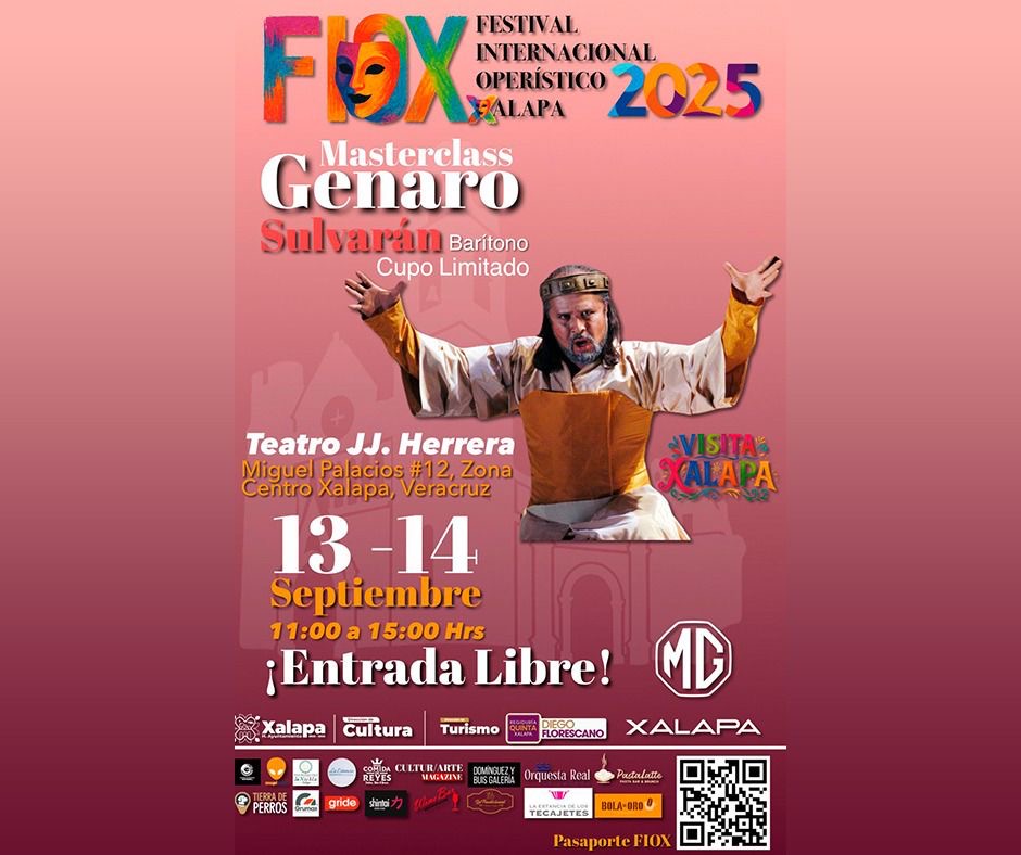 A las 11:00 horas, en el Teatro J. J. Herrera, se inaugurará el Festival Internacional Operístico Xalapa 2025 (FIOX), con masterclass de Genaro Sulvarán y de Silvia Guillot, a las 16:00 horas.