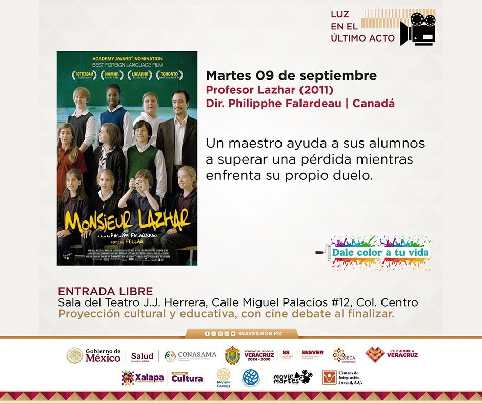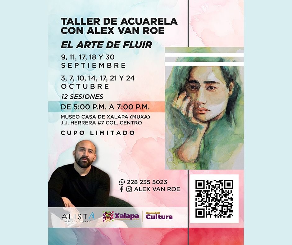 El martes, a las 17:00 horas, en el Museo Casa de Xalapa (Muxa), se impartirá el taller de acuarela “El arte de fluir”, con Alex Van Roe. En el Teatro J. J. Herrera, continuará el ciclo “Luz en el último acto”, organizado por la Red Xalapeña de Cineclubes y la Comisión Estatal contra las Adicciones, con la proyección de la película “Profesor Lazhar”, a las 18:00 horas.