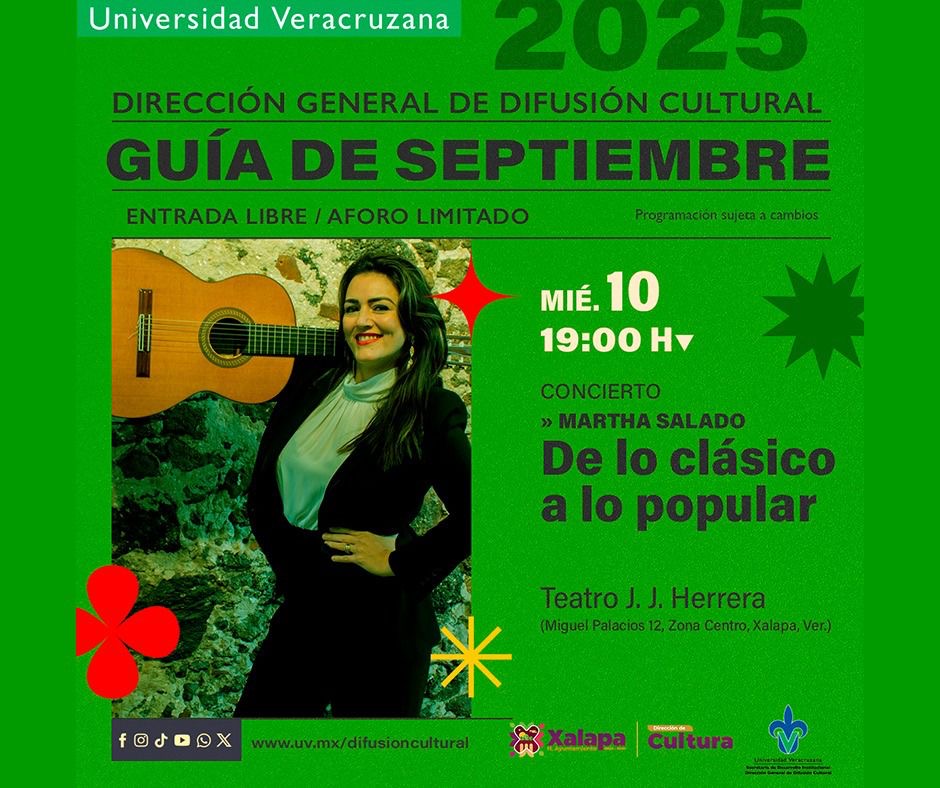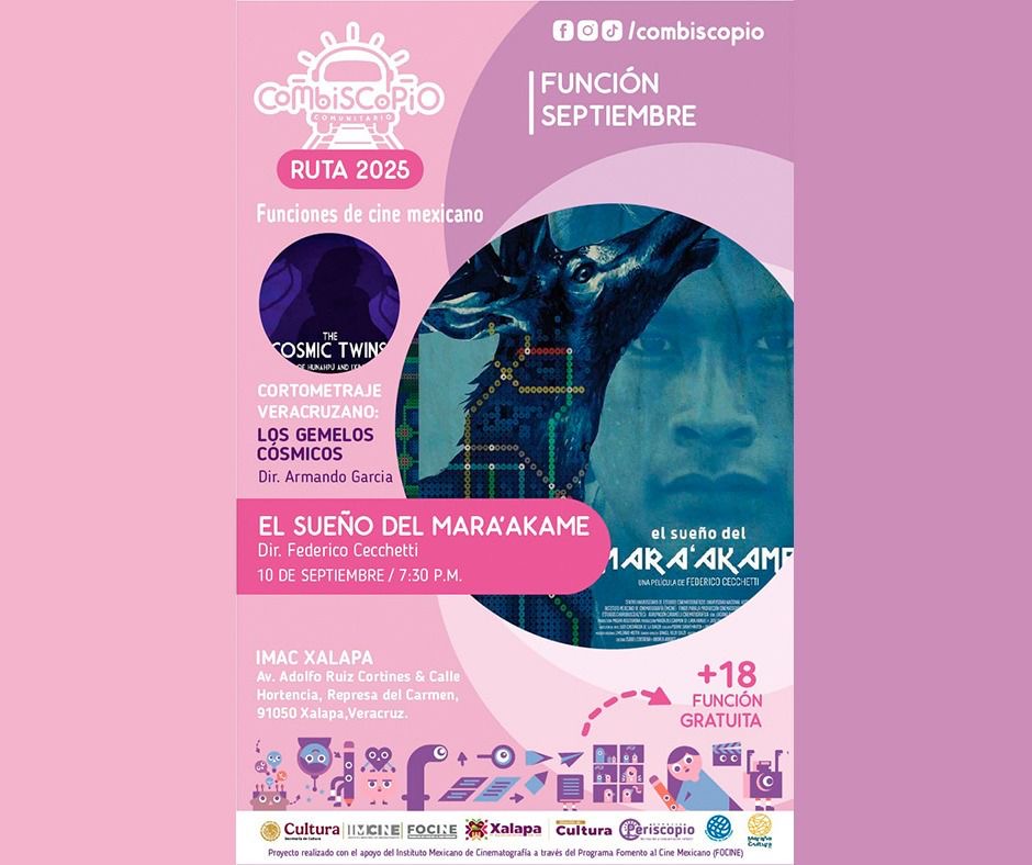 A las 19:00 horas, en el Teatro J. J. Herrera, se presentará la guía cultural de septiembre con el concierto de Martha Salado, media hora más tarde, en el auditorio de la IMAC, continuará la programación de cine mexicano de COMBISCOPIO, con el cortometraje veracruzano “Los gemelos cósmicos” y la película “El sueño de Mara’Akame”.