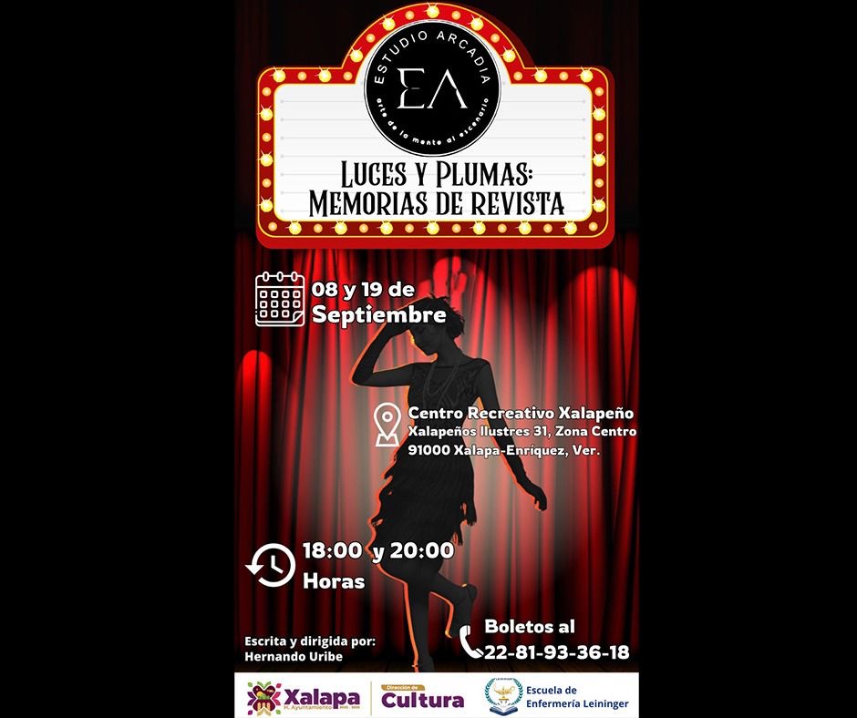 Este lunes, en el Centro Recreativo Xalapeño (CRX), el Estudio Arcadia presentará la obra “Luces y plumas, memorias de revista”, escrita y dirigida por Hernando Uribe, con funciones a las 18:00 y 20:00 horas.