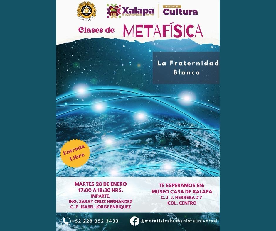 Este martes 28 de enero, se llevará a cabo la charla “La fraternidad blanca”, a cargo de Saray Cruz Hernández, como parte de las clases de metafísica. La cita es en el Museo Casa de Xalapa (Muxa) a las 17:00 horas.
