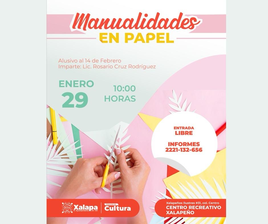 El miércoles 29 de enero, a las 10:00 horas, se realizará el taller de Manualidades en papel, impartido por Rosario Cruz Rodríguez, en el Centro Recreativo Xalapeño (CRX).