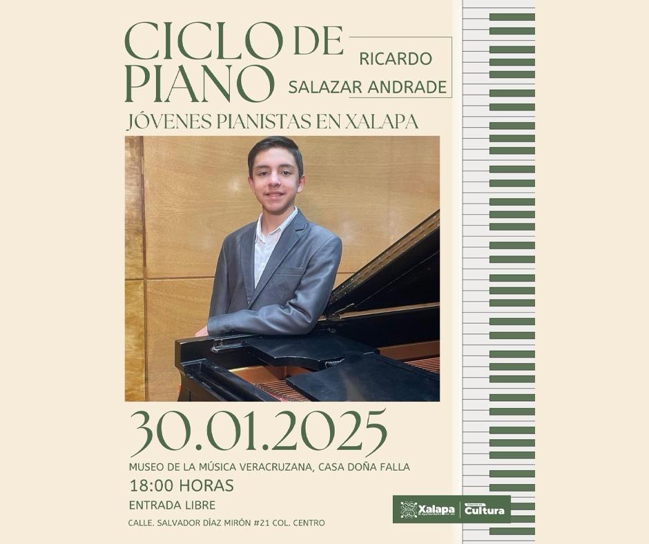 Como parte del Ciclo de Piano Jóvenes Pianistas en Xalapa, Ricardo Salazar Andrade se presentará a las 18:00 horas en el Museo de la Música Veracruzana. Para los amantes del cine, se proyectará “Linda quiere pollo”, a las 19:00 horas, en el CRX. A la misma hora, en el Teatro del Estado, la Orquesta Municipal de Xalapa ofrecerá el concierto Cultura Pop Vol. 1.