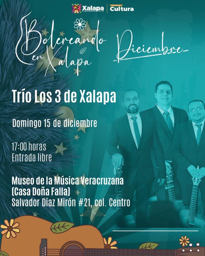 A las 17:00 horas regresa al Parque Juárez Danzón Pa’l Corazón, mientras que en el Museo de la Música Veracruzana, se presentará el trío “Los 3 de Xalapa”. A las 18:00 horas, el Centro Cultural “Andanzas” ofrece Lunas de Oriente, en el Teatro J. J. Herrera.