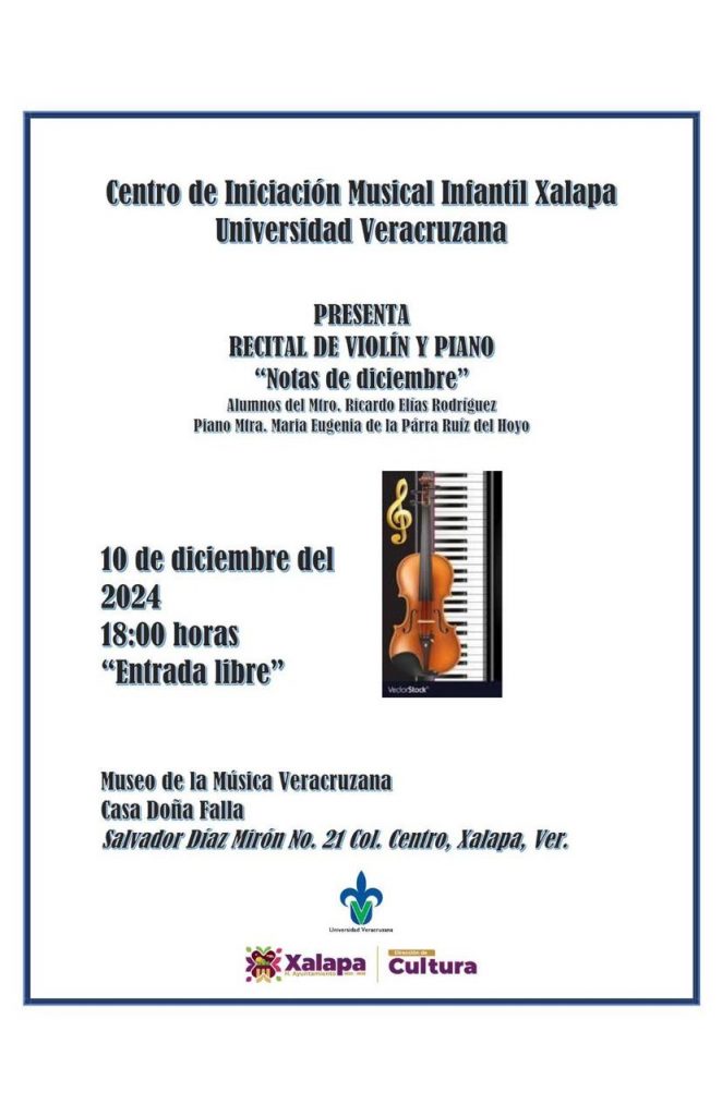A las 18:00 horas, el Centro de Iniciación Musical Infantil Xalapa de la Universidad Veracruzana llevará a cabo el recital de violín y piano: “Notas de diciembre”, en el Museo de la Música Veracruzana.